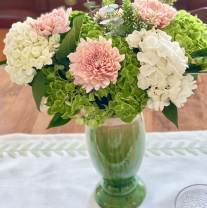 The second Mother’s Day Bouquet was store bought flowers. I used Hydrangea’s with and randomly placed palms and greenery. I added the tan colored, Crysanthemum’s at the end to even it out.The green vase is another vase that I have had for a while, but you find it in the link below The color scheme of my Mother’s Day table setting will have the same colors.
