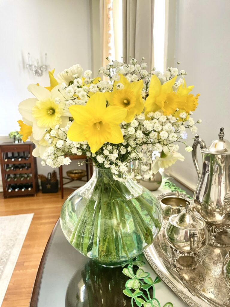 Making your own Mother’s Day Bouquet, reflects not only your creativeness but the love and effort you put into your flower arrangement, shows your mother just how special she is to you. If you are hosting your loved ones for lunch or dinner, your table and the effort you put into decorating it just right, warms the heart. Adding a personal touch shows that you really thought about the people attending. I love to decorate a table and see everyones reaction to walking into a beautifully design table. It’s such a warm welcome. Here, I have encorporated different china, silverware, napkins and party favors, to give a few ideas on how to mix everything together but how to make it blend. The daffodil arrangement was daffodil’s that I picked from my garden, beautiful yellow and white. I added store bought baby’s breath, a total favorite of mine that fits in with any simple arrangment. The vase I have had for a long time, like a lot of my collections. I love the shape of this vase, it’s so classic. I added green glass beads at the bottom to pull it together.